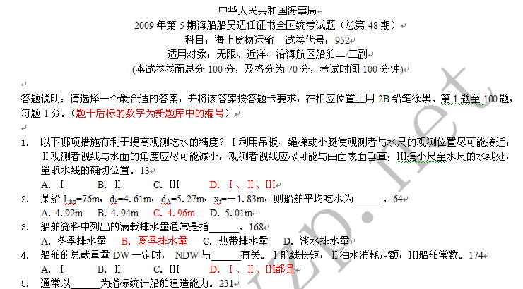2009年第5期海船船員適任證書全國統(tǒng)考試題(總第48期)